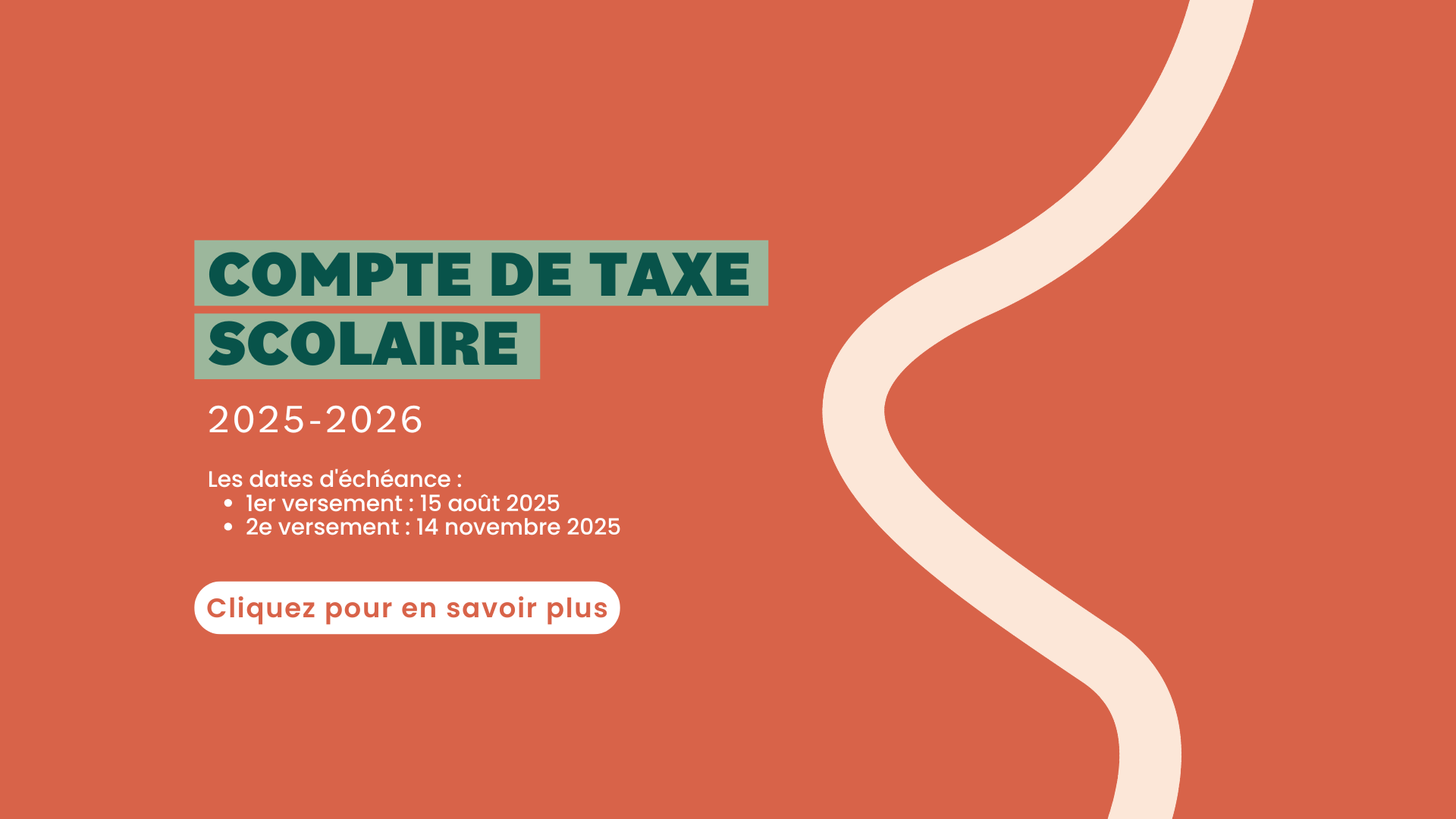 Nouveau taux 2025-2026 Le nouveau taux de taxe scolaire pour l’année 2025-2026 est fixé à 0,08423 $ par 100 $ d’évaluation foncière. Conformément à l’article 28 de la Loi sur l’administration fiscale, le taux d’intérêt applicable en cas de non-paiement est de 8 % pour cette même année. Les dates d’échéance : 1er versement : 15 août […]