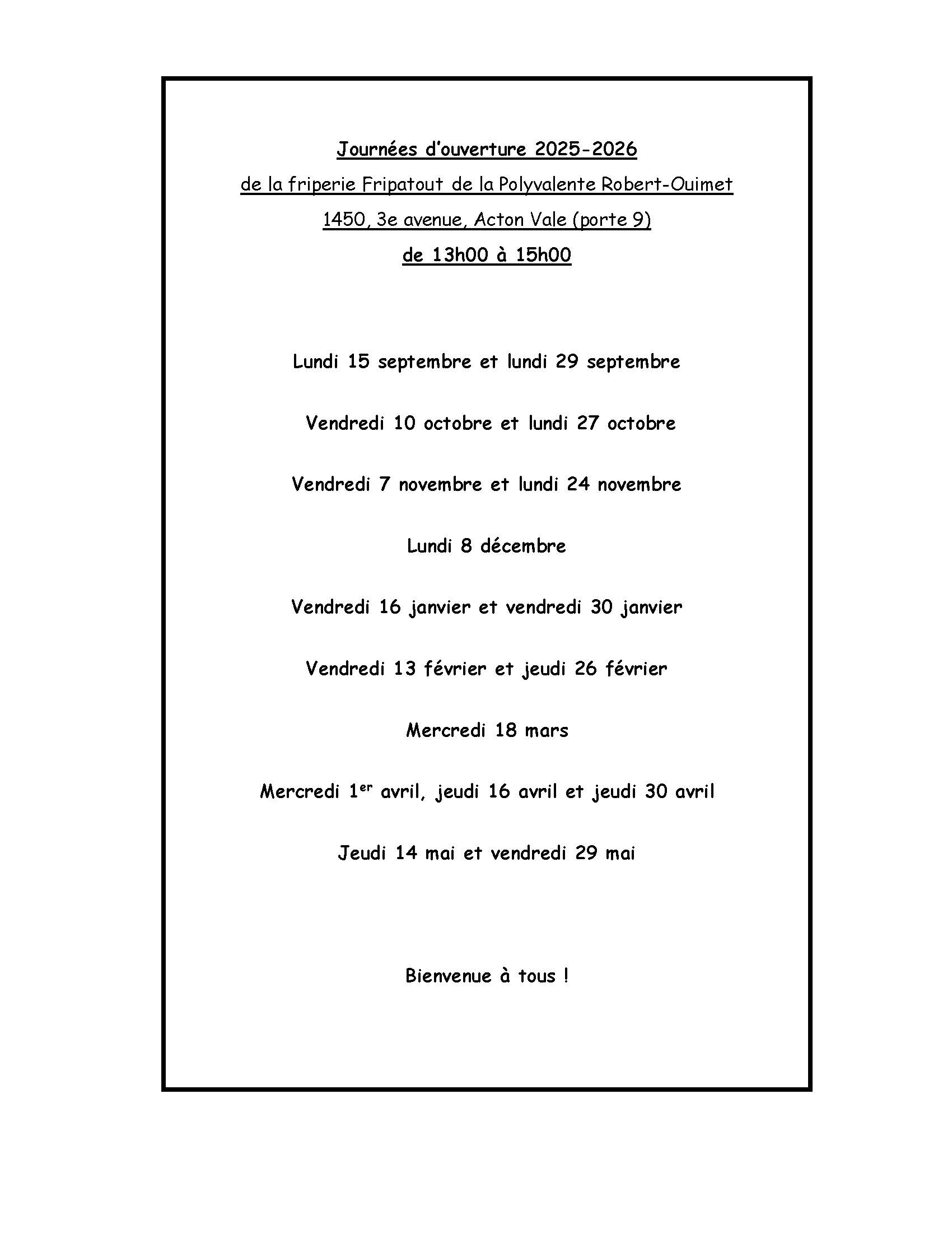 De plus, la friperie ouvre ses portes au public quelques fois par année lors des journées pédagogiques. Surveillez le journal La Pensée de Bagot et Radio-Acton pour les dates à venir.